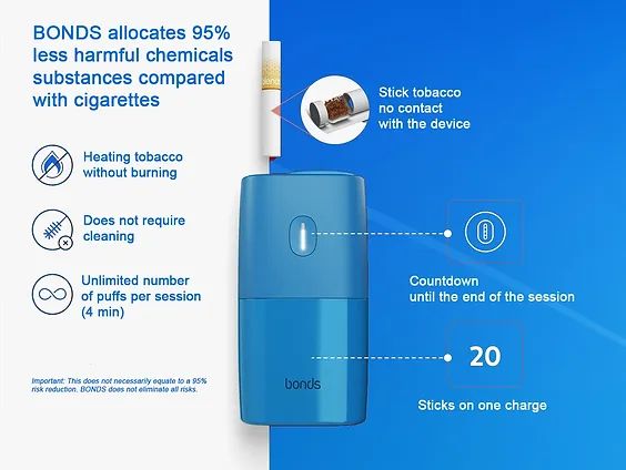 По принципу работы BONDS — это система нагрева табака. Устройство (в отличие от сигарет) не поджигает табак, а нагревает специальные стики BLENDS, пока из них не испарится аэрозоль. Поэтому, в отличие от сигарет, которые горят, с BONDS отсутствует риск случайного ожога других людей, домашних животных, одежды и мебели. BONDS также не создаёт запаха сигаретного дыма.